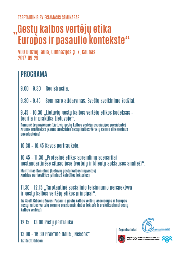 Seminaras „Gestų kalbos vertėjų etika Europos ir pasaulio kontekste“ Daugiau informacijos rasite paspaudus nuorodą čia. Kategorija: LKD, Skelbimai2017 28 rugsėjo Autorius: admin Post navigationAnkstesnisAnkstesnė naujiena:2017 m. spalio mėn.KitasKita naujiena:2017 m. spalio 28 d.Related PostsDėmesio 2023 m. balandžio 13 d. 14:00 – 17:00 val. vyks susitikimas su VMI atstovais2023 15 kovo2023 m kovo 16 d. 17:30 val. Kviečiame į susitikimą su Kauno miesto socialinių paslaugų centro atstove2023 15 kovo2023 m. balandžio 6 d. 18:00 val. Kviečiame į spektaklį (su titrais)2023 15 kovo2023 03 02 Kviečiame į paskaitą „Smurtas artimoje aplinkoje”2023 28 vasario2023 02 16 d. 12:00 val. Kviečiame į Vasario 16 d. minėjimą2023 3 vasario2023 02 09 d. 17: 30 val. Kviečiame į susitikimą su kandidatu į Kauno miesto merus Gintautu Labanausku2023 3 vasario