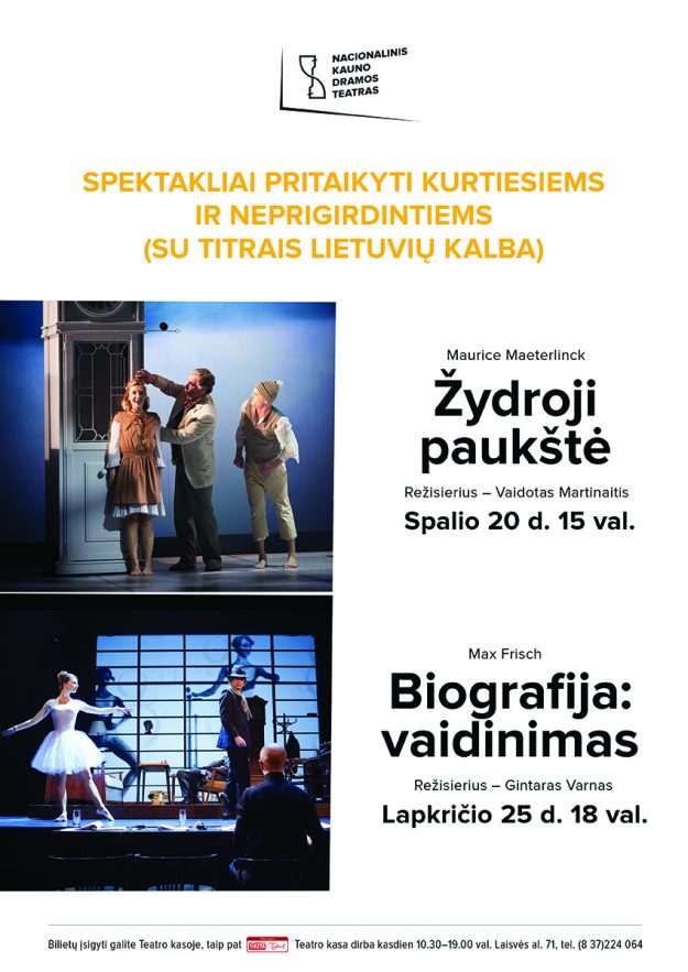 2018 m. spalio 20 d. 15 val. ir lapkričio 25 d. 18 val. Kitos informacijos, Skelbimai2018 11 spalioSpektakliai pritaikyti kurtiesiems ir neprigirdintiems (su titrais lietuvių kalba).
