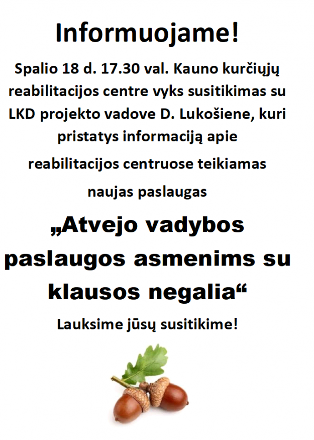 2018 m. spalio 18 d. 17:30 val. Skelbimai2018 11 spalioSusitikimas su LKD projekto vadove D. Lukošiene, pristatys „Atvejo vadybos paslaugos asmenims su klausos negalia”.