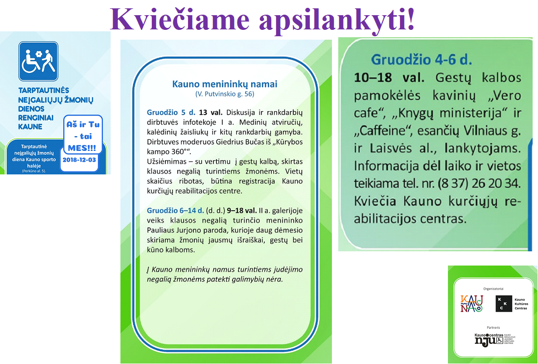 Kviečiame apsilankyti neįgaliųjų dienos renginiuose Kategorija: Kitos informacijos, Skelbimai2018 28 lapkričio Autorius: admin Post navigationAnkstesnisAnkstesnė naujiena:2018 m.KitasKita naujiena:2018 m. gruodžio 31 d. 19 val.Related PostsNepriežiūra: smurtas prieš vyresnio amžiaus moteris2026 8 balandžioProjekto „Tylioji Kauno istorija“ paskaita apie Gubernijos laikų Kauną2026 7 kovoProjektas „Asmenų su klausos negalia įgalinimas atpažinti ir reaguoti į smurtą lyties pagrindu“2025 15 gruodžioProjektas „Negirdžiu, bet atpažįstu: seksualinio smurto prevencija ir saugumo užtikrinimas asmenims su klausos negalia“2025 15 gruodžio„Šviesa tamsoje, garsas tyloje“ – įgyvendintas unikalus Ąžuolyno bibliotekos projektas, keičiantis patirtis2025 10 gruodžioProjektas „Tylioji Kauno istorija“2025 15 rugsėjo