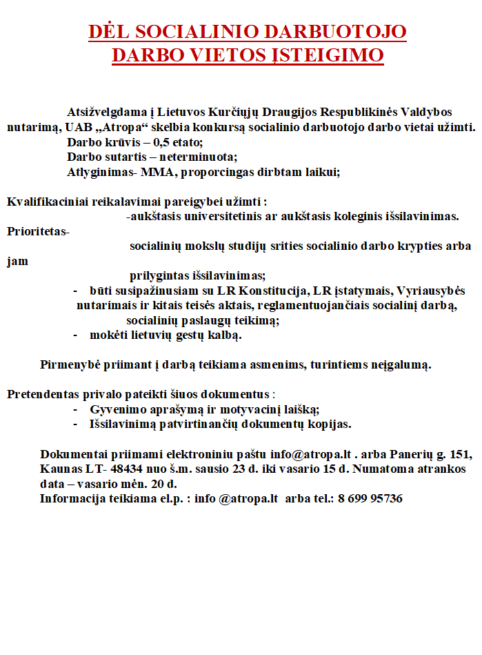 UAB „Atropa“ skelbia konkursą socialinio darbuotojo darbo vietai užimti Kategorija: Kitos informacijos2019 23 sausio Autorius: admin Post navigationAnkstesnisAnkstesnė naujiena:2019 m. vasario 7 d.KitasKita naujiena:2019 m. sausio 24 d. 17:30 val.Related PostsNepriežiūra: smurtas prieš vyresnio amžiaus moteris2026 8 balandžioProjekto „Tylioji Kauno istorija“ paskaita apie Gubernijos laikų Kauną2026 7 kovoProjektas „Asmenų su klausos negalia įgalinimas atpažinti ir reaguoti į smurtą lyties pagrindu“2025 15 gruodžioProjektas „Negirdžiu, bet atpažįstu: seksualinio smurto prevencija ir saugumo užtikrinimas asmenims su klausos negalia“2025 15 gruodžio„Šviesa tamsoje, garsas tyloje“ – įgyvendintas unikalus Ąžuolyno bibliotekos projektas, keičiantis patirtis2025 10 gruodžioProjektas „Tylioji Kauno istorija“2025 15 rugsėjo