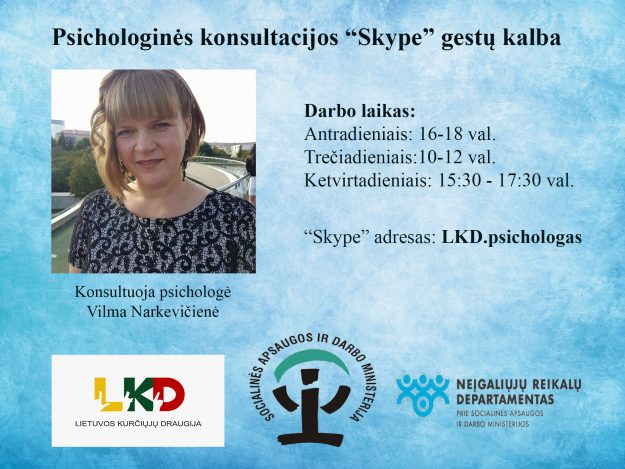 Primename, kad LKD psichologė Vilma Narkeviciene teikia psichologo konsultacijas nuotoliniu būdu. Šiuo įtemptu laikotarpiu jeigu jaučiate stresą, nerimą arba norite išsikalbėti įvairiais klausimais, skambinkite SKYPE vaizdo skambučiu LKD.psichologas