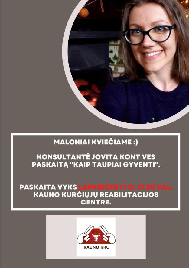 Konsultantė Jovita Kont ves paskaitą „Kaip taupiai gyventi“. Paskaita vyks lapkričio 17 d. 17:30 val. Kauno kurčiųjų reabilitacijos centre. Adresu: Uosio g. 7, Kaunas