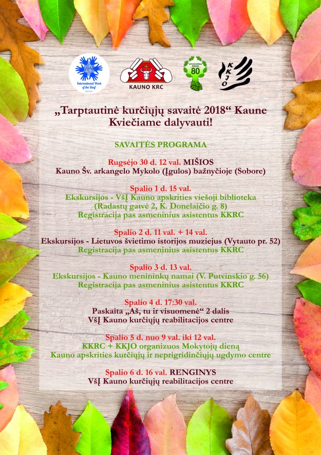 2018 m. nuo rugsėjo 30 d. iki spalio 6 d. Skelbimai2018 24 rugsėjo„Tarptautinė kurčiųjų savaitė 2018” KAUNE. Kviečiame dalyvauti!